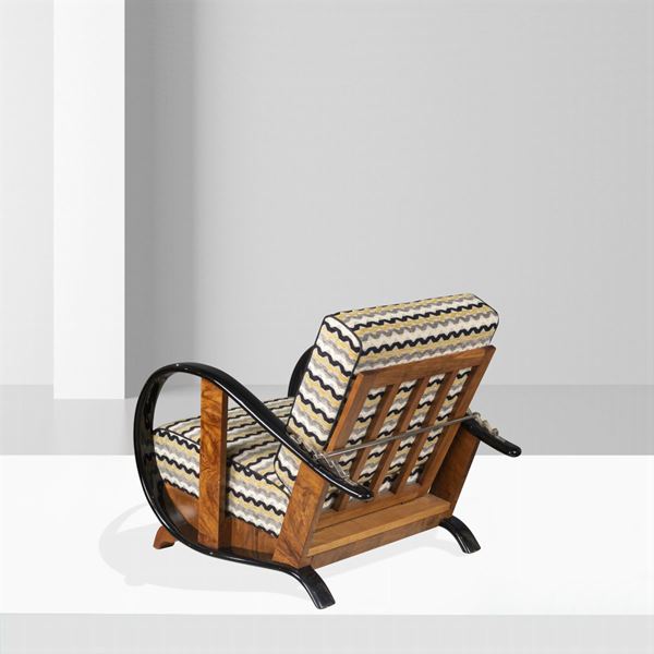 Decò reclining armchair in walnut and ebonized wood, upholstered fabric, 77x71x97 cm.