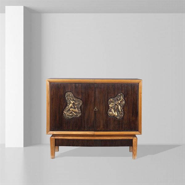ash and stained wood bar cabinet, plaques in gilded wood, 95x111x40,5 cm.