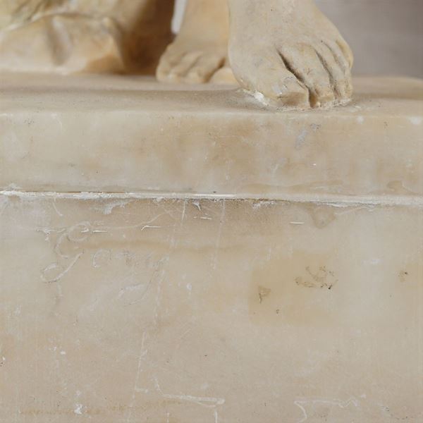 alabaster sculpture depicting a young lady, signed on the base, restorations and defects, 54x23x14 cm.