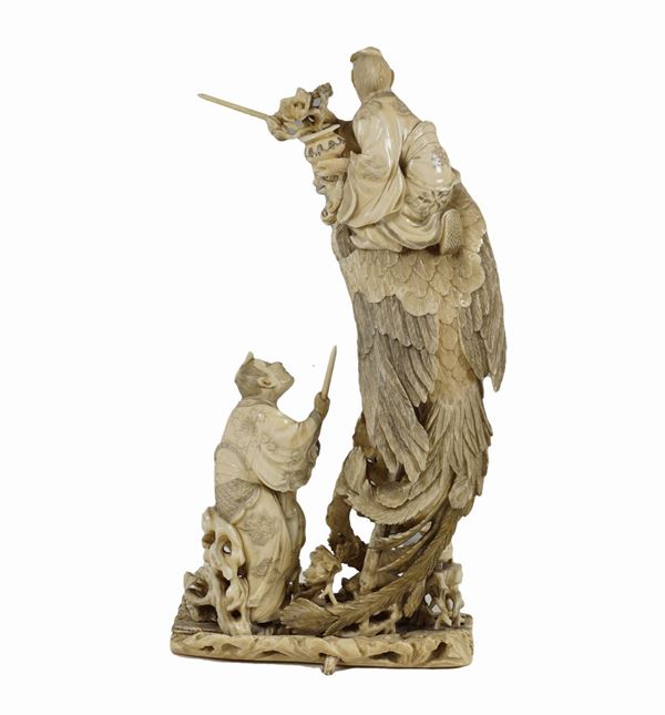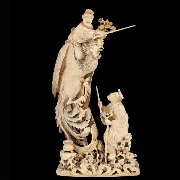 depicting characters and animals, base inlaid with floral and vegetal patterns, h. 31 cm.