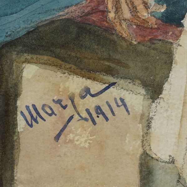 "Confidenze", watercolor on paper, signed and dated 1914 at the lower left, framed, 24x24 cm.