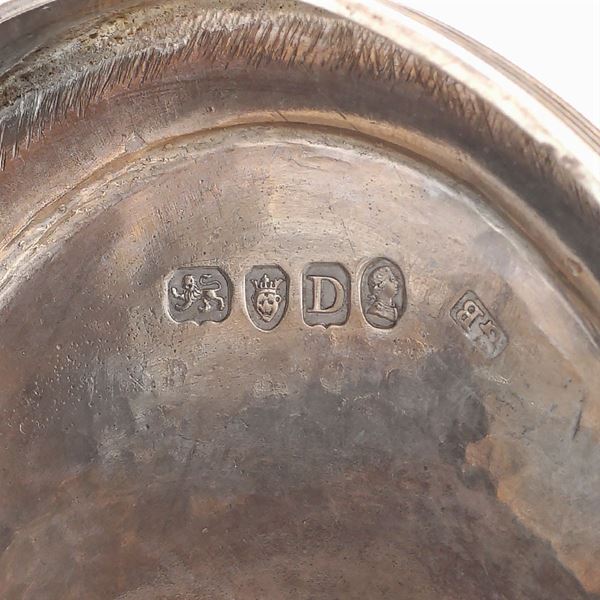 marks of George Burrows, plain body inlaid with vegetal patterns, shaped wood handle, weight 830 gr., h. 30 cm.