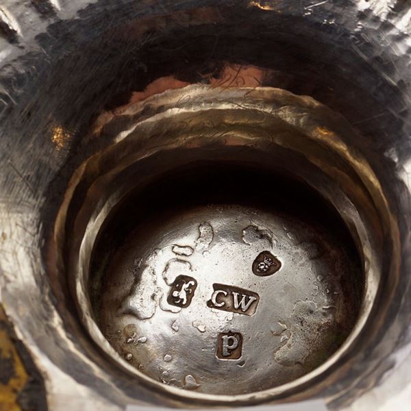 mark Charles Watts, pear shaped body, chiselled with floral and vegetal scroll patterns, wooden shaped handle, h. 31 cm., peso 982 gr.