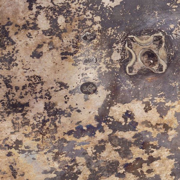 Giuseppe Giovara goldsmith, Turin, body chiselled with floral, vegetal and scroll patterns, cut crystal bottles complete with caps, 31x21,5x10 cm., 31x21,5x10 cm.