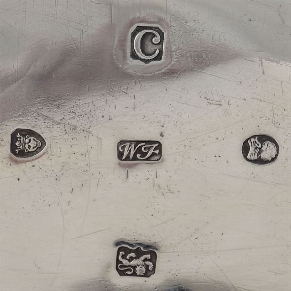 mark of William Fountain, fluted body with vegetal and shell motives, defects, h.14 cm., peso 728 gr.