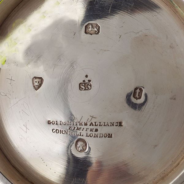 marks of Goldsmiths & Alliance, chiseled body with vegetal and floral motifs, flower-shaped lid grip, weight 740 gr., h. 13 cm.