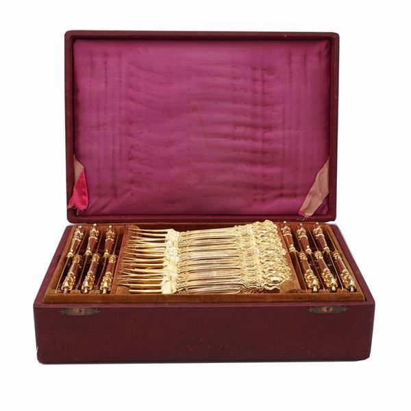 chiseled with vegetal motifs, weight 1497 gr., comprising: 12 forks, 12 spoons, 24 knives, within a case, 9x35x25 cm.