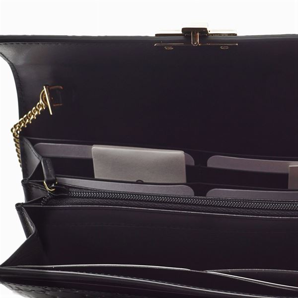 made of signature black leather, gold metal finishes, interior with five compartments, twelve card slots, gold metal chain shoulder strap and padlock closure, excellent condition