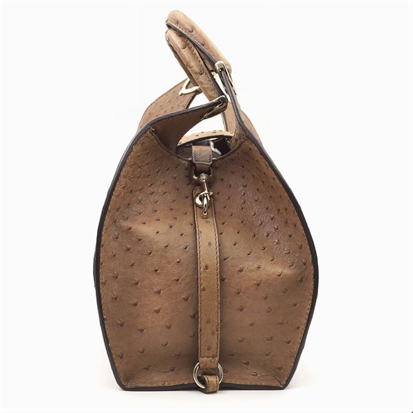 beige ostrich leather, golden metal details, hand handles, hook closure and front flap with stirrup motif, three inside pockets, excellent condition Complete with fabric case, 37x38,5x20 cm.