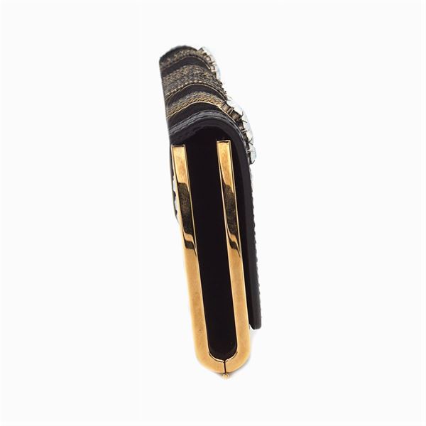 made of black suede decorated with stones, beads and sequins, gold metal and black lizard details, concealed magnetic closure, good condition