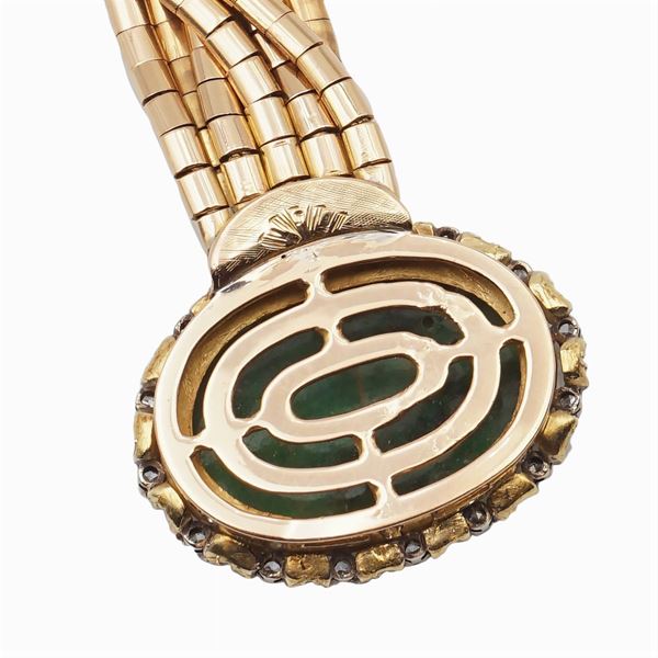 nine strands joined by concealed clasp with oval jade set engraved with naturalistic motifs within a 18kt yellow gold frame and brilliant cut diamonds 0.18 ct, length 17 cm., peso 71,8 gr.