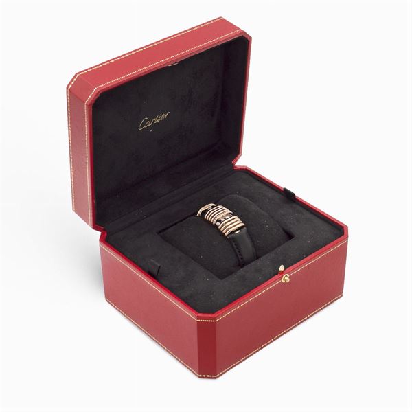 16x39 mm. rectangular case in 18kt rose gold, titanium and brilliant-cut diamonds, ref. 2611 - 62179CE ,concealed silvered sunburst dial, sapphire crystal, quartz movement, original leather strap with 18kt rose gold deployant buckle, signed case, dial and movement Complete with box