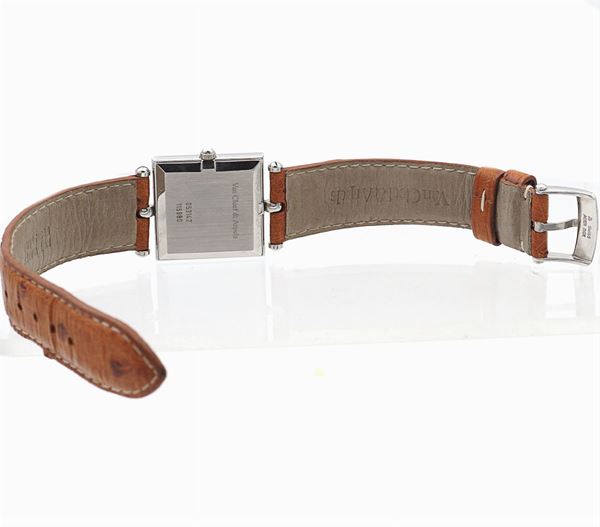 steel 26 mm. carrè case ref. 053142 - 11590 black dial with indexes and arabic numerals, quartz movement, leather strap with original steel buckle, signed case, dial and movement