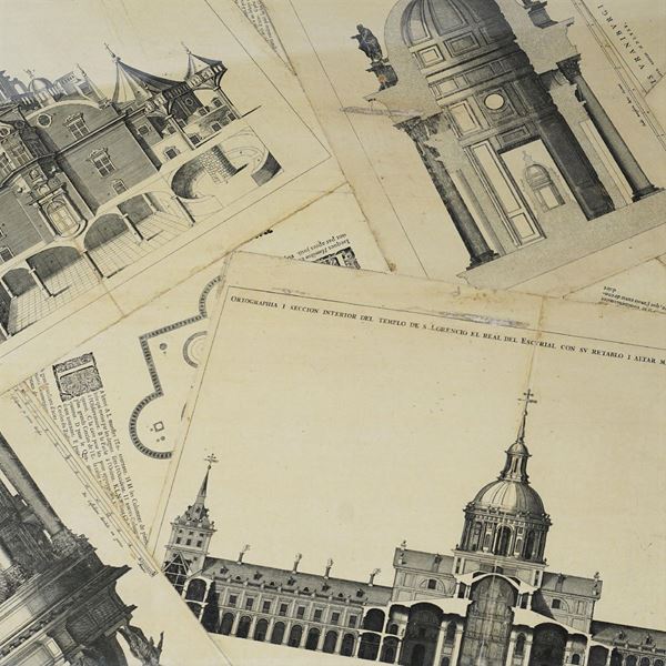 low table in black wood, architectural prints and brass, 32x165x76 cm.
