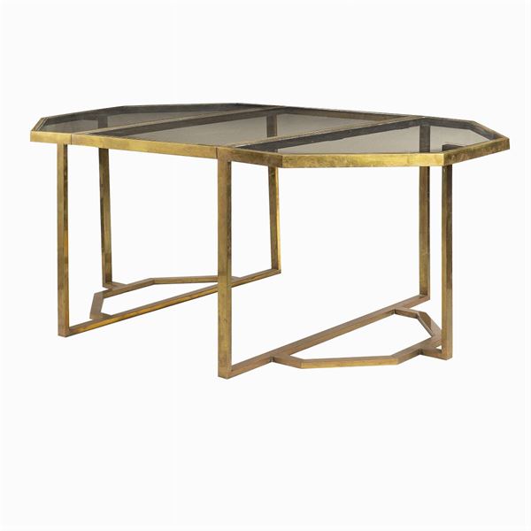 brass and smoked glass octagonal extendable table, complete with 68 cm extension, convertible into two consoles,, 73x120x120cm.