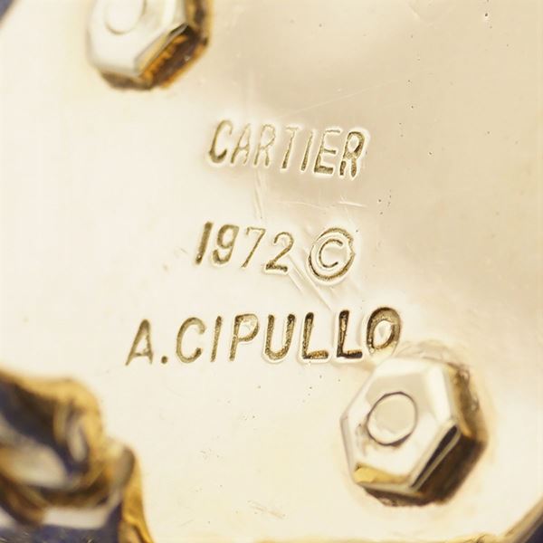 weight 41,5 gr.made in 18kt yellow gold and lapis lazuli circular section, signed and dated on the back, diameter 3 cm.