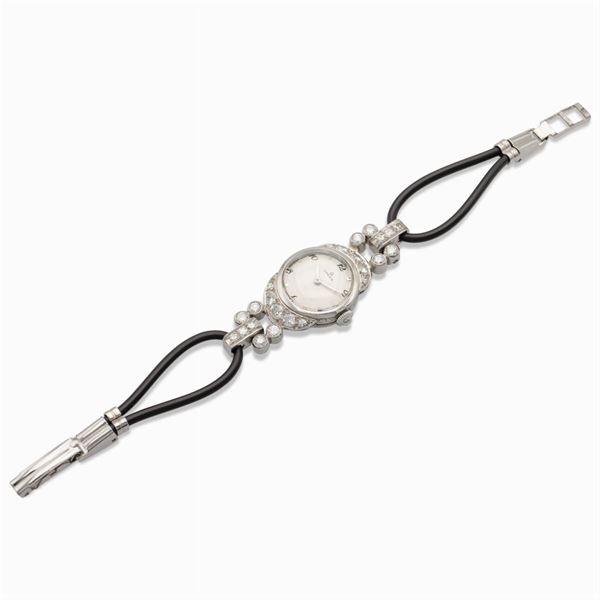 in platinum, round case 19 mm. on the sides brilliant-cut diamonds circa 1.50 ct, white dial with Arabic numerals, mechanical movement with manual winding, series n. 11275817, R 13.5 omega caliber, non coeval rubber and metal strap, length 16.5 cm.