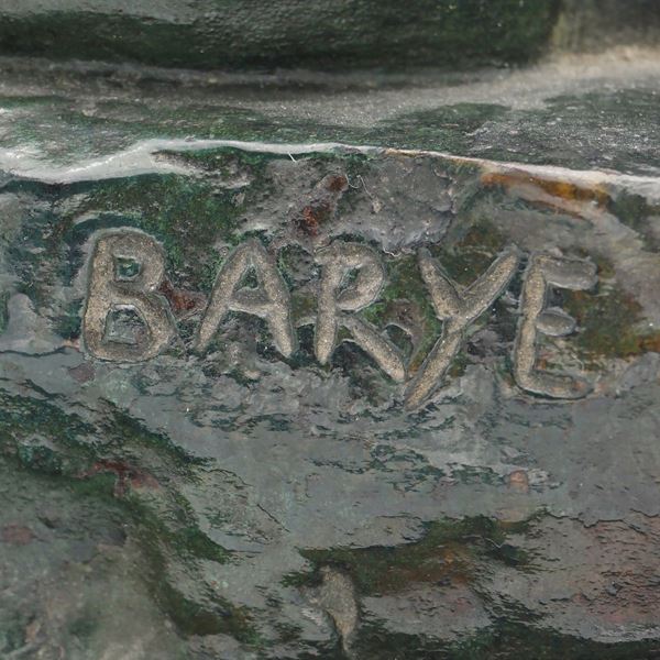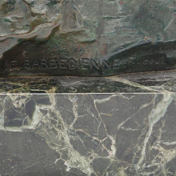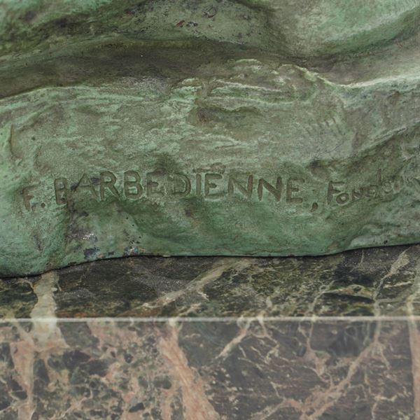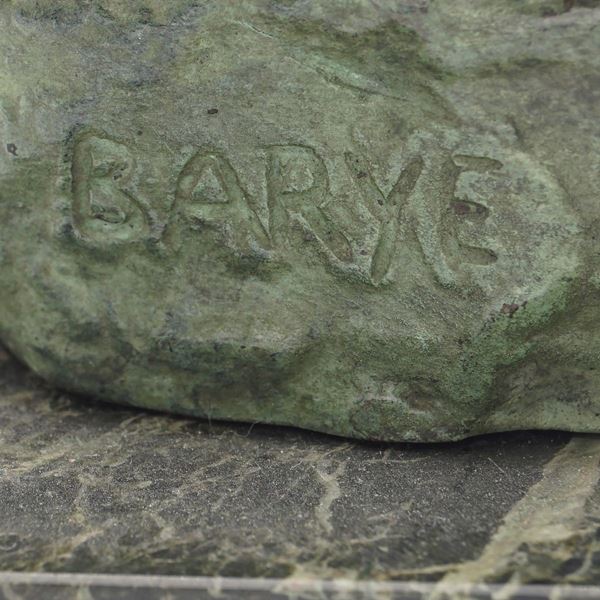 13x21x9 cm."Panthère de Tunis - Panthère de l'India n°1",  two burnished bronze sculptures, signed Barye and F. Barbedienne fondeur, rectangular bases in green Alpi marble