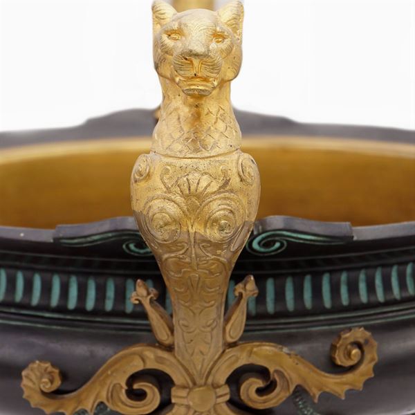 chiseled with vegetal motifs and masks, lateral grips in the shape of lions, red marble base on feral feet