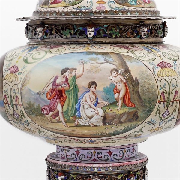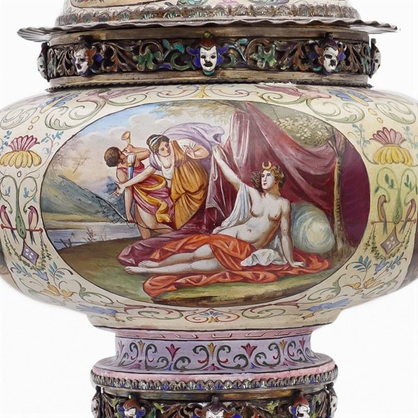 h. 42 cm.marks of Hermann Böhn, circular body enameled and decorated with mythological scenes, slight defects