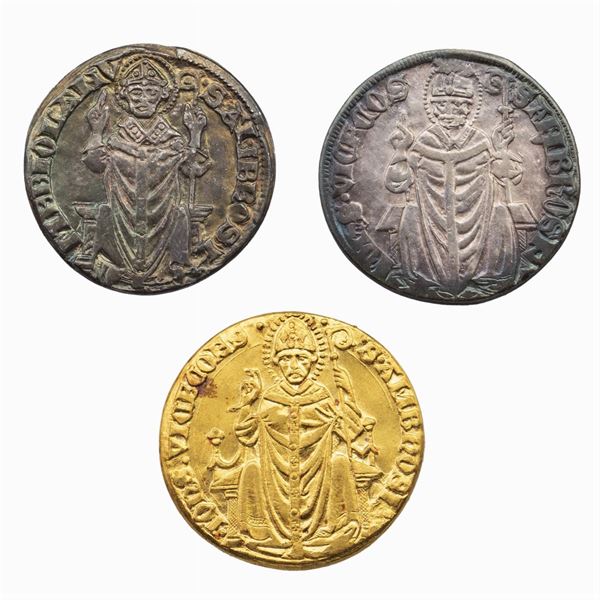 weight gold gr. 5, silver gr. 8a gold florin, 2 large silver Luchino and Giovanni Visconti, reproductions, within case