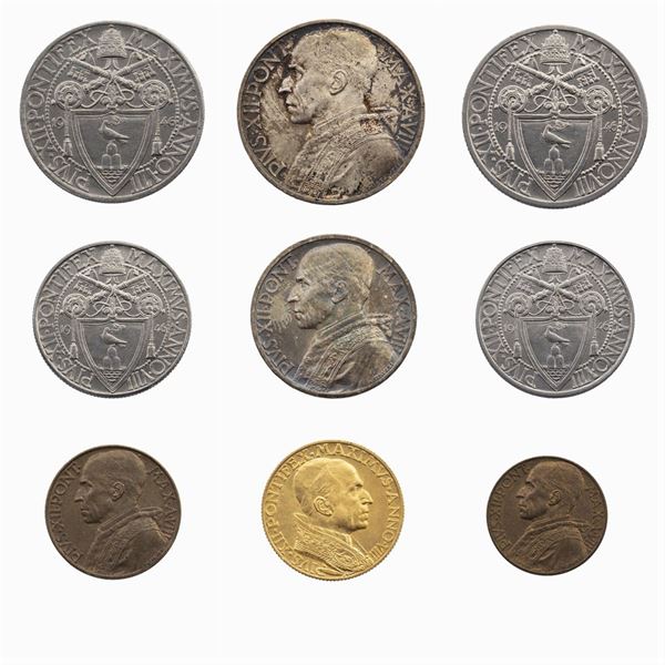 weight gold gr. 5,2 silver gr. 43Set of coins minted by the Vatican City depicting Pope Pius XII one in gold, 6 in silver, 2 in bronze, 900/1000 gold title within case