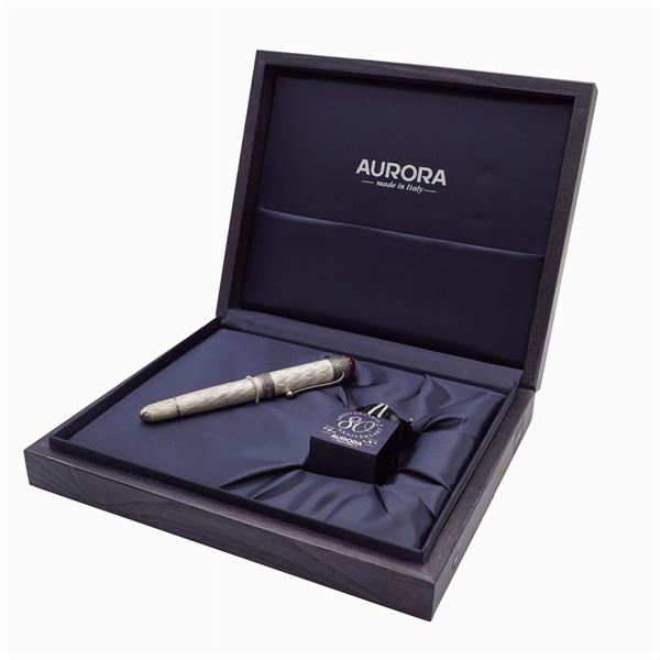 length 13.5 cm.in silver and burgundy resin, 18kt white gold nib, n. 0249, complete with original box and a glass table inkwell