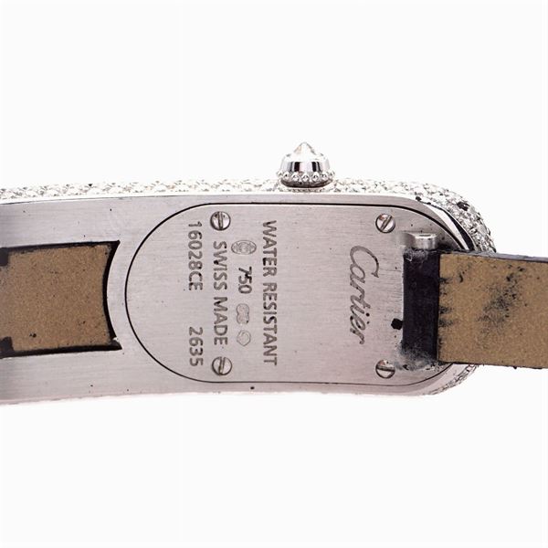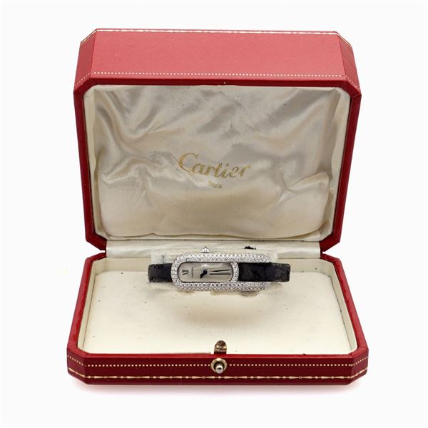 circa 2000sin 18kt white gold and brilliant cut diamonds, 42x16 mm case. ref. 616028CE - 2635, silver dial WJ301650 with Roman numerals at 12 and 6 o'clock, sapphire crystal, crown with diamond, quartz movement, Cartier 059 caliber, strap with original leather and white gold buckle with brilliant-cut diamonds, signed case, dial and movement