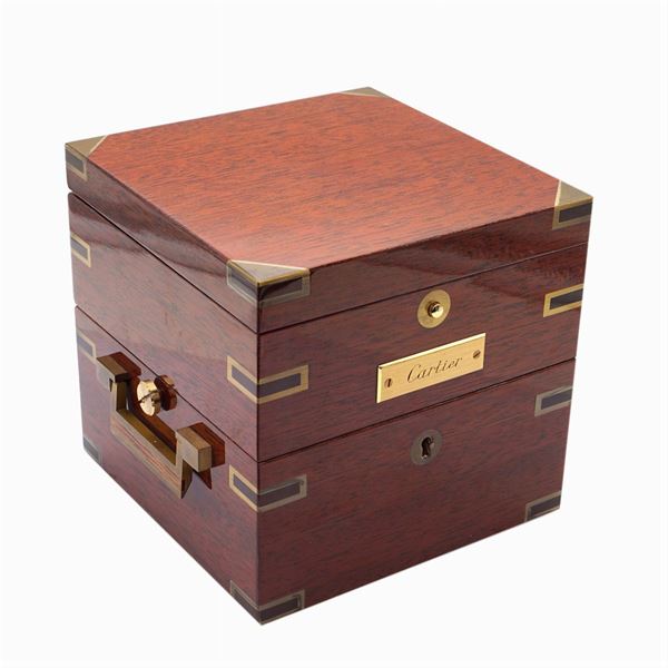 14x15x15 cm.in brass and metal, round case 95 mm. white dial with Roman numerals, ref. 1871204, quartz movement, wooden case with quartz movement, key case missing
