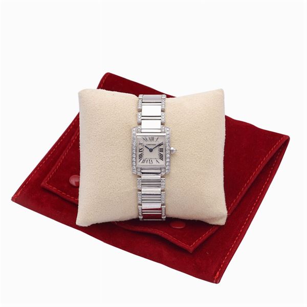 weight 93 gr.in 18kt white gold and brilliant cut diamonds circa 1,80 ct, rectangular case 20x25 mm. ref. 2403 - M6283932 silver dial with Roman numerals, crown with diamond, sapphire crystal, quartz movement, Cartier caliber 057.06, original bracelet in 18kt white gold and diamonds with retractable folding clasp, signed case, dial and movement, complete with fabric case