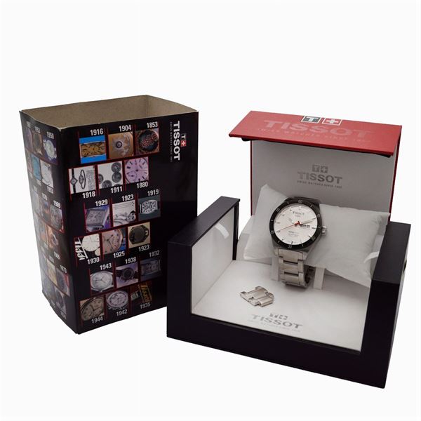 in steel, 42 mm round case. ref. T044430A - 12BC0876519, silver dial with indexes, date display at 3 o'clock, black bezel, sapphire crystal, mechanical movement with visible automatic winding, original steel bracelet with folding clasp, one additional link, signed case, dial and movement, complete with box
