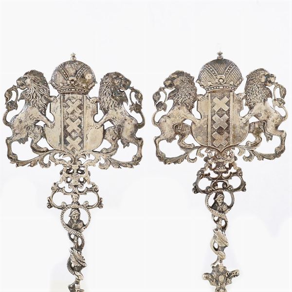 L. 33 cm.decorated with the coat of arms of the city of Amsterdam and genre scenes, total weight 480 gr.
