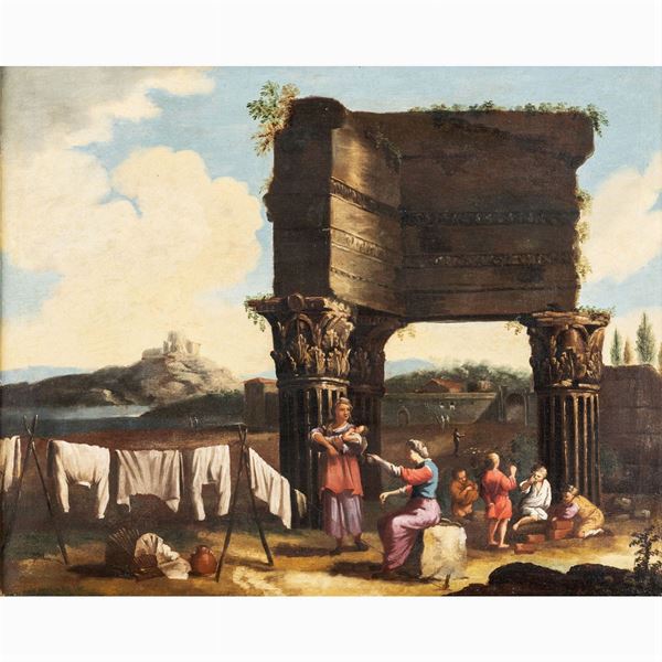 50x61.5 cm."Concert and nocturnal dance" and "Women hanging out the laundry among the ruins", a pair of oils on canvas, within a gilded wood frame