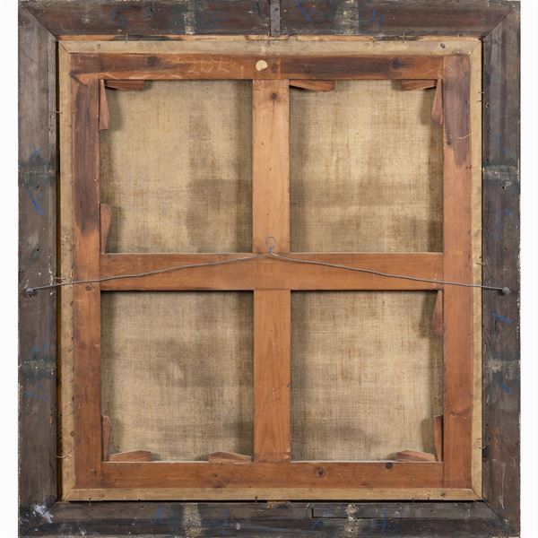 95x87 cm."Still life with dog and sculpture", oil on canvas, framed