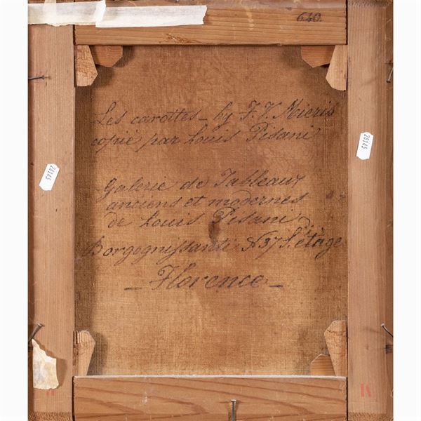 35x30 cm."Le carottes", oil on canvas, copy from Van Mieris, within a gilded wood frame. Provenance Sotheby's London 1998