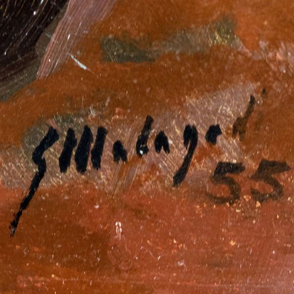 50x60 cm."Natura morta", oil on panel, signed and dated '55 at the lower right, framed