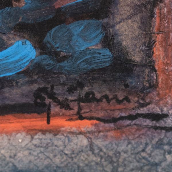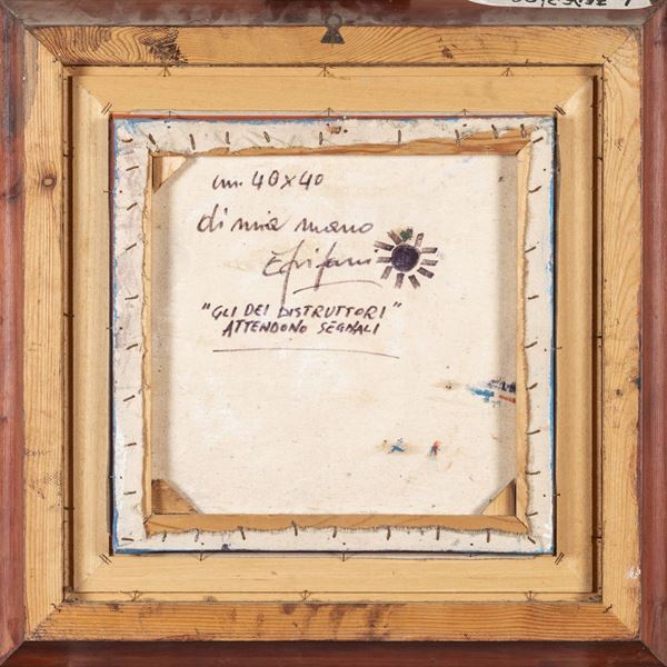 40x40 cm."Gli dei distruttori attendono segnali", mixed technique on canvas, signature Epifani at the lower right, framed