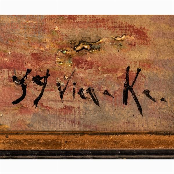 50 x35 cm."A passeggio sulla spiaggia", oil on canvas, signed at the lower right, framed