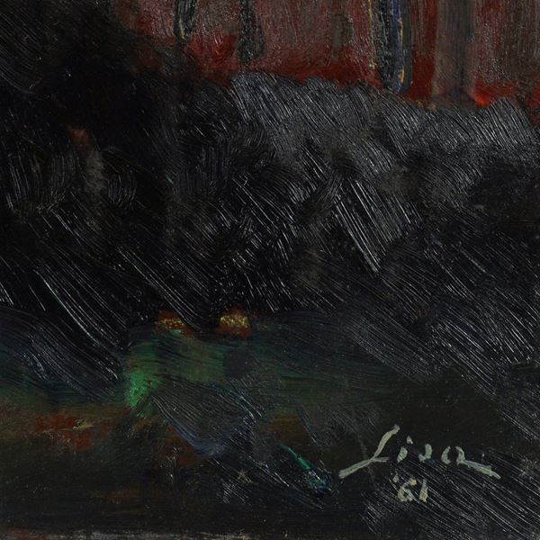 50x70 cm."Fabbrica di Chivasso al tramonto", 1961, oil on panel, signed and dated lower right, framed