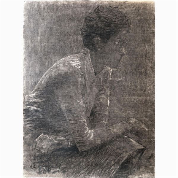 69x61 cm."Giovane ragazzo seduto - Figura femminile"pair of charcoals on paper, signed lower right and left, framed