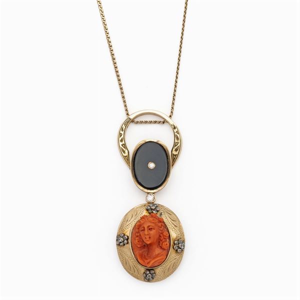 weight 24 gr.depicting a female profile surrounded by diamond roses and surmounted by a black onyx plaque and two antique brilliant cut diamonds, the pendant folds on itself and becomes a ring, pendant size 6.7x2.5 cm, ring size 13, complete with 18kt yellow gold necklace, length 50 cm.
