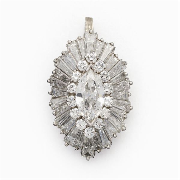 weight 16 gr.F/G color - VS clarity surrounded by brilliant and tapered cut diamonds circa 5.20 ct color F/G - VVS clarity, the ring can be dismantled becoming a pendant, size 17