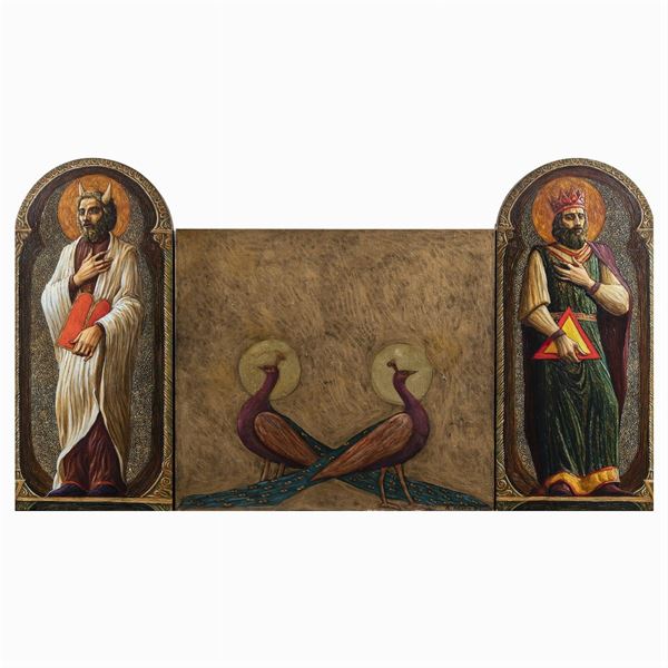 50x91 cm."San Giorgio e il drago con Salomone e Mosè -", 1996, oil polyptych on panel, signed and dated lower center