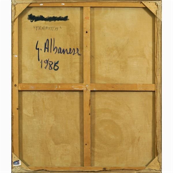 158x138 cm."Trafitta", 1986, mixed technique on canvas, signed and dated on the back, framed