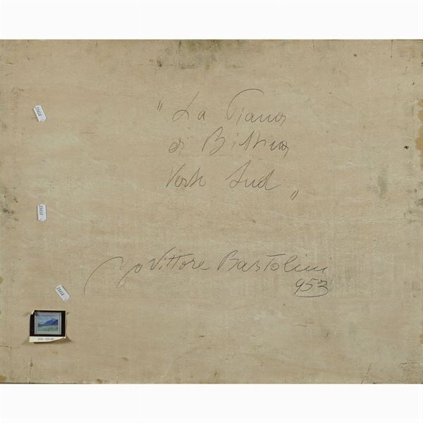 53x76 cm."La piana di Bissina verso sud", 1953, oil on panel, signed and dated lower right and on the back
