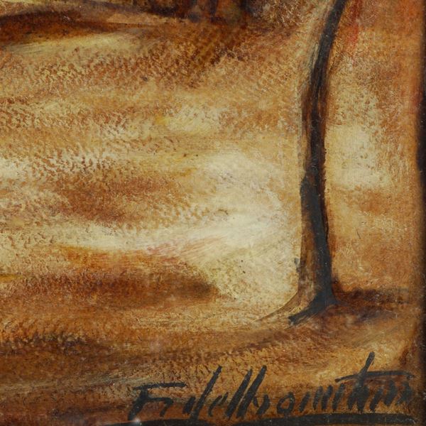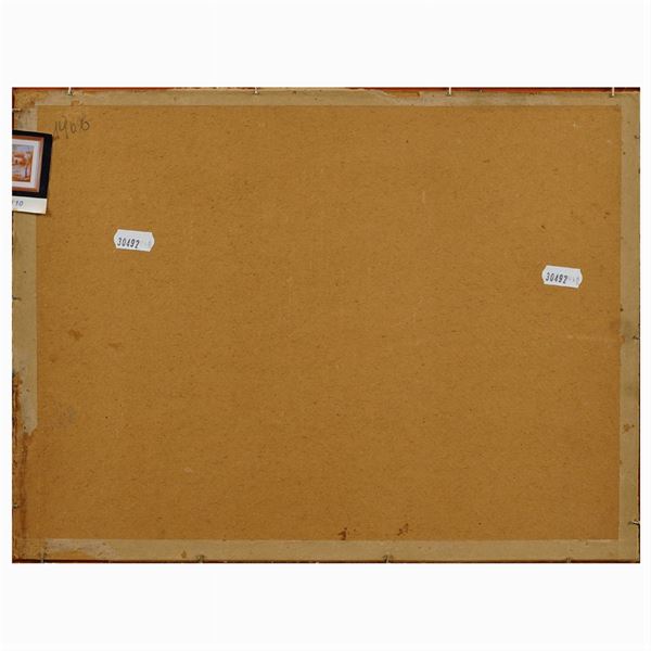 30x40 cm."Paesaggio con alberi e casolari", olio su cartone, firmato in basso a destra, datato 1968 sul retro