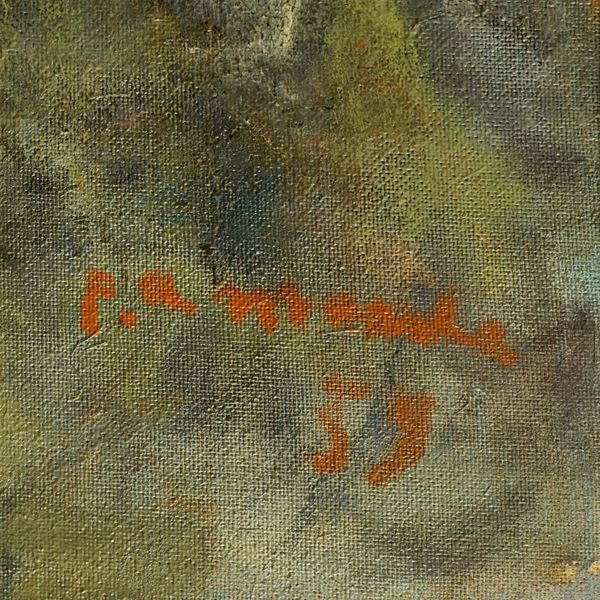 "Cavalieri sardi", 1959, olio su masonite, firmato e datato in basso a destra