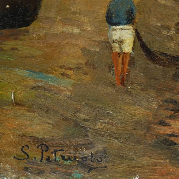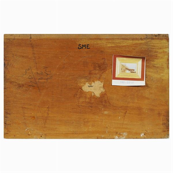 "Marina con barche", olio su tavoletta, firmato in basso a sinistra