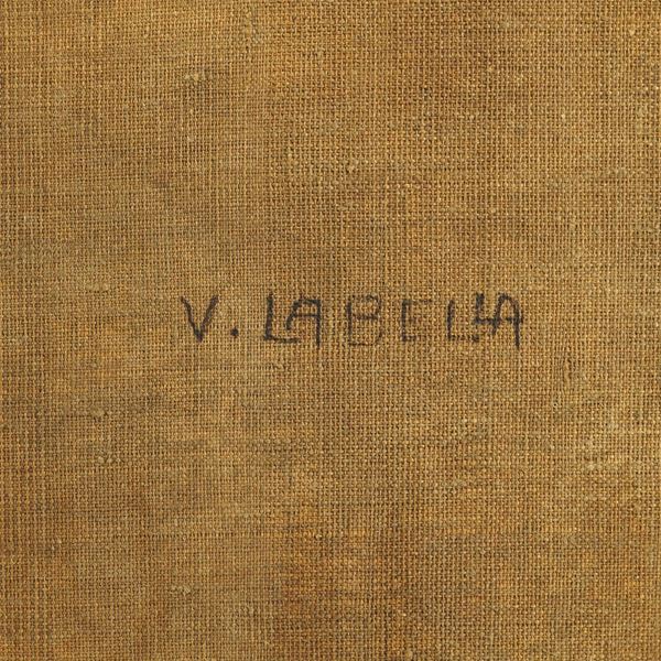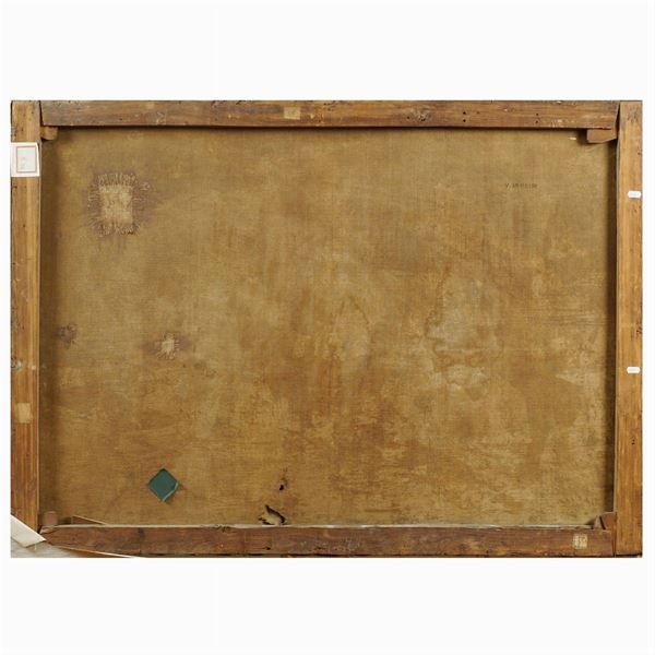 "Paesaggio marino con barche", olio su tela, firmato sul retro, strappi alla tela
