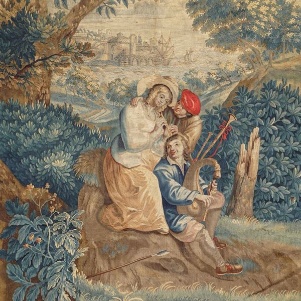 310x200 cm."Concerto campestre", tapestry, signed lower right, slight wears